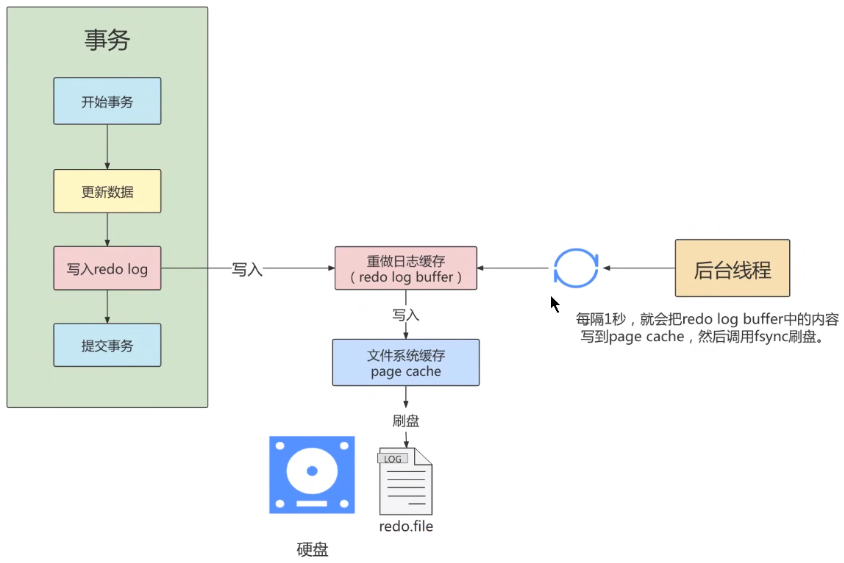 另外,InnoDB存储引擎有一个后台线程,每隔1秒,就会把 redo log buffer 中的内容写到文件系统缓存( page cache ) ,然后调用刷盘操作。