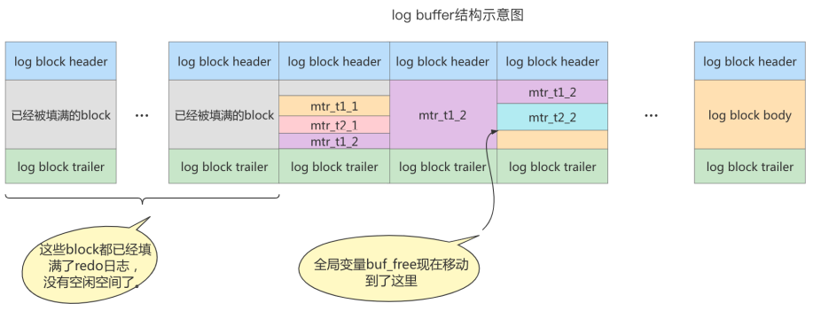 向log buffer中写入redo日志的过程是顺序的,也就是先往前边的block中写,当该block的空闲空间用完之后再往下一个block中写。当想往log buffer中写入redo日志时,第一个遇到的问题就是应该写在哪个block的哪个偏移量处,所以InnoDB的设计者特意提供了一个称之为buf_free的全局变量,该变量指明后续写入的redo日志应该写入到 log buffer中的哪个位置,如图所示: