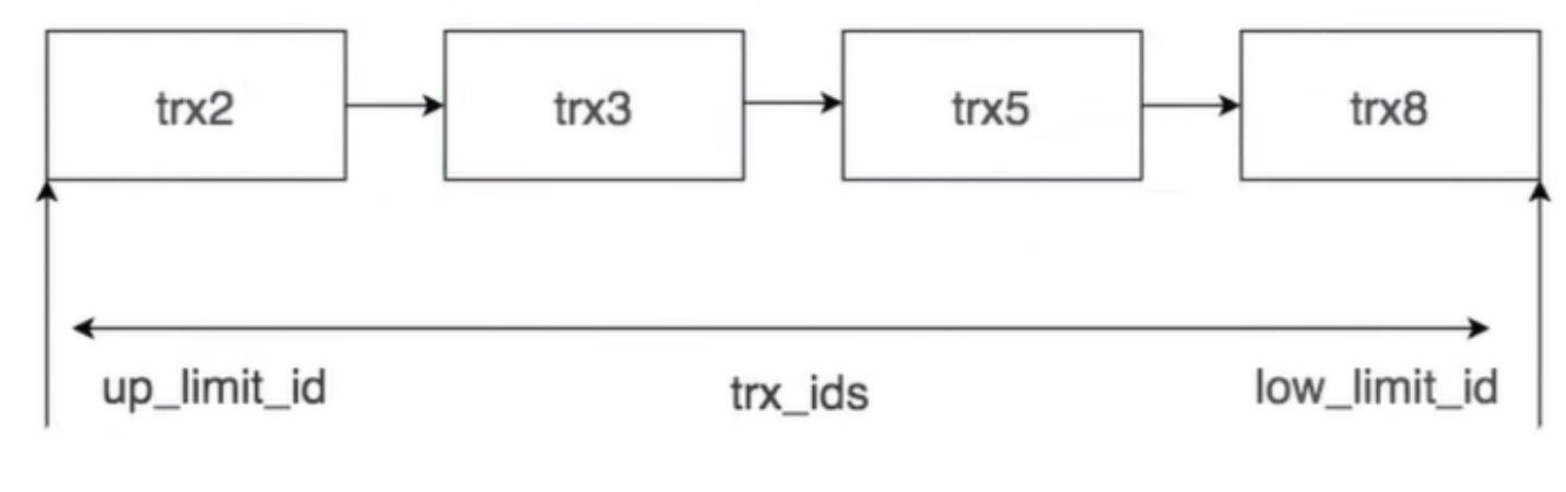 trx_ids为trx2、trx3、trx5和trx8的集合,系统的最大事务ID (low_limit_id)为trx8+1(如果之前没有其他的新增事务),活跃的最小事务ID (up_limit_id)为trx2。